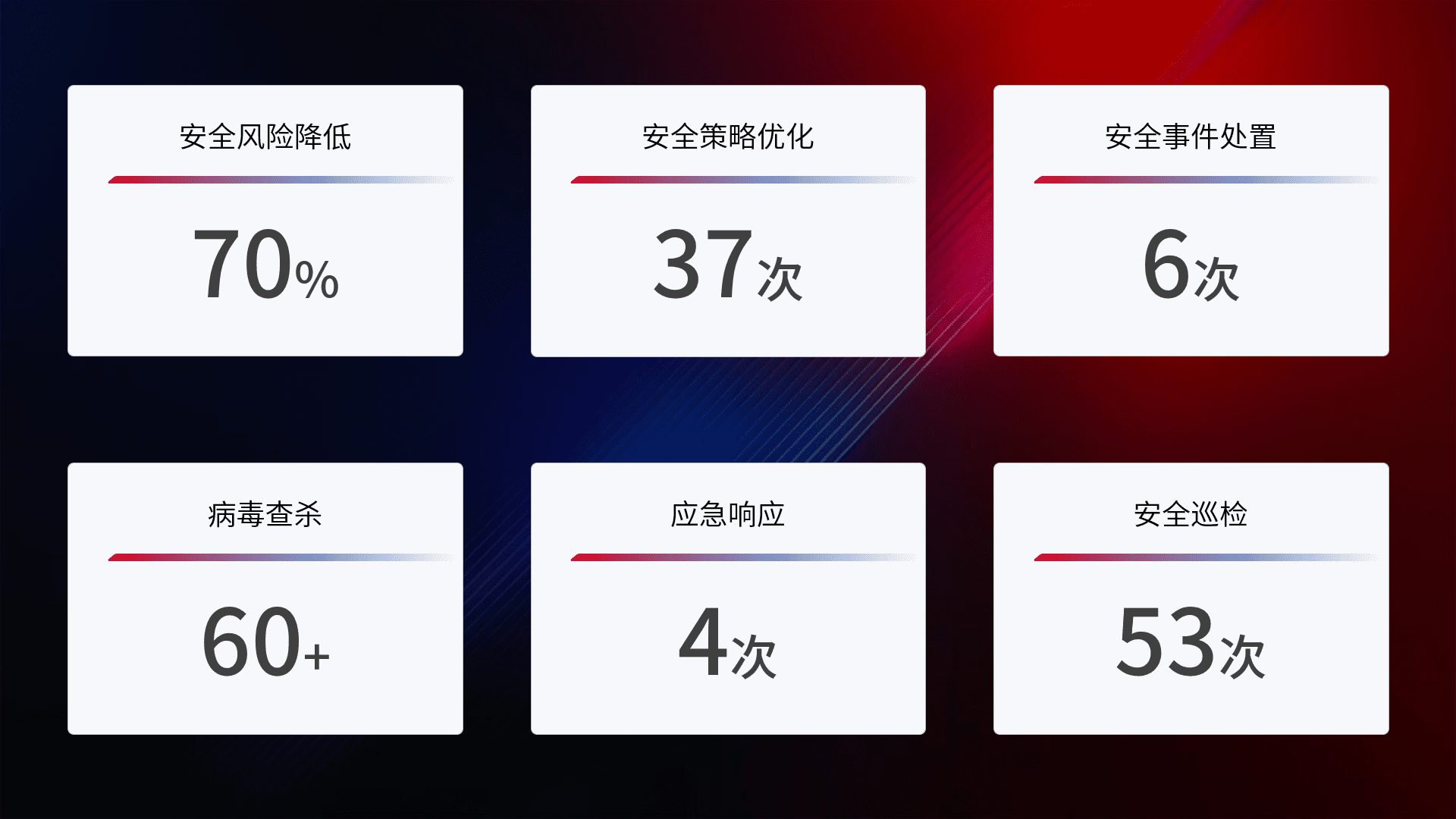 提供全面的安全事件报告体系,,,,包括处置报告、、周报、、、季度和年度总结,,结合持续监控,,帮助客户深入了解网络安全状况。。。