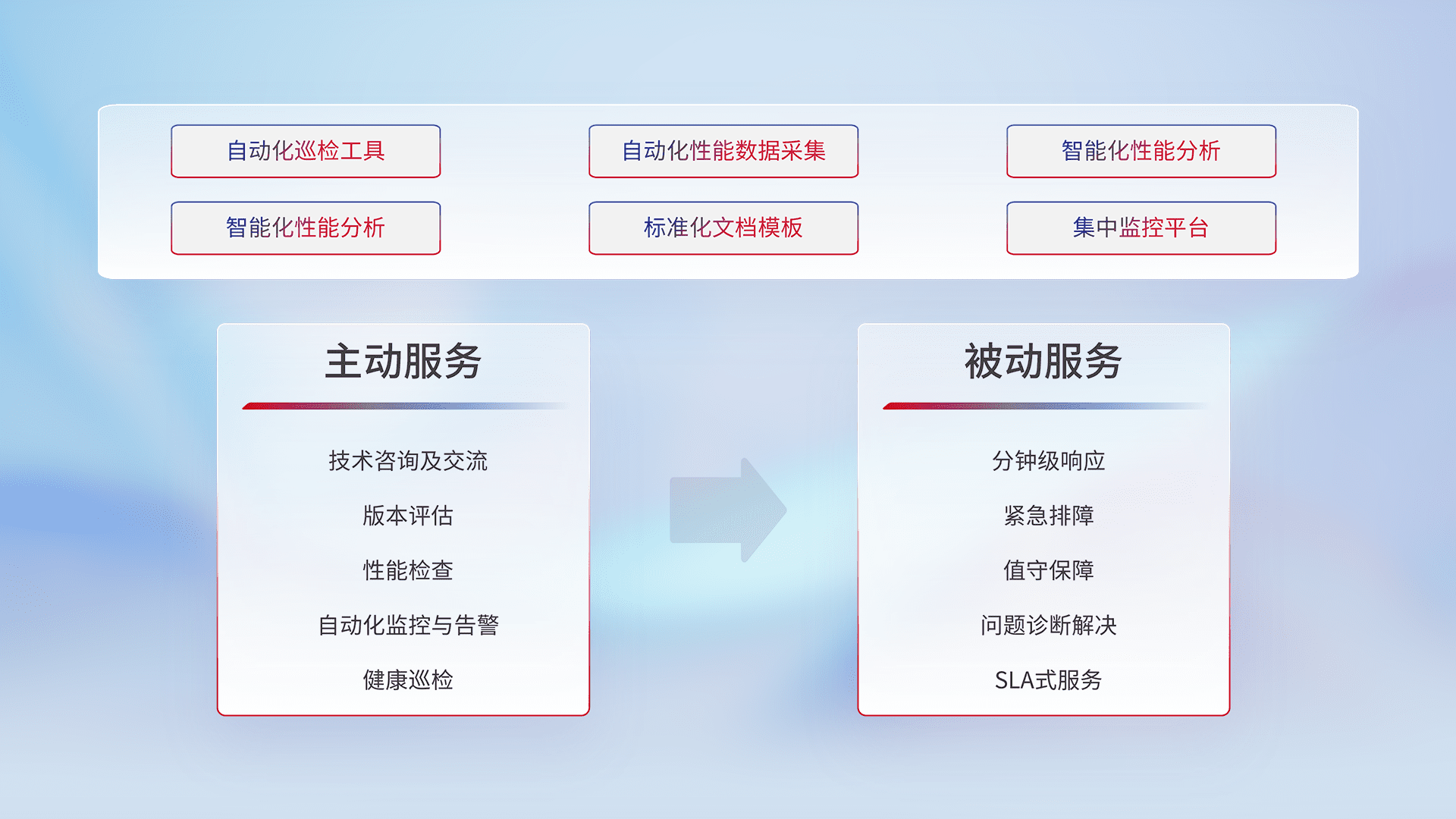 智能化工具和标准化文档,,,,保障服务质量,,提供主动服务(包含技术咨询、、版本评估、、性能检查、、、自动化监控与告警、、健康巡检)和被动服务包含(分钟级响应、、紧急排障、、值守保障、、问题诊断解决、、SLA服务)。。。。