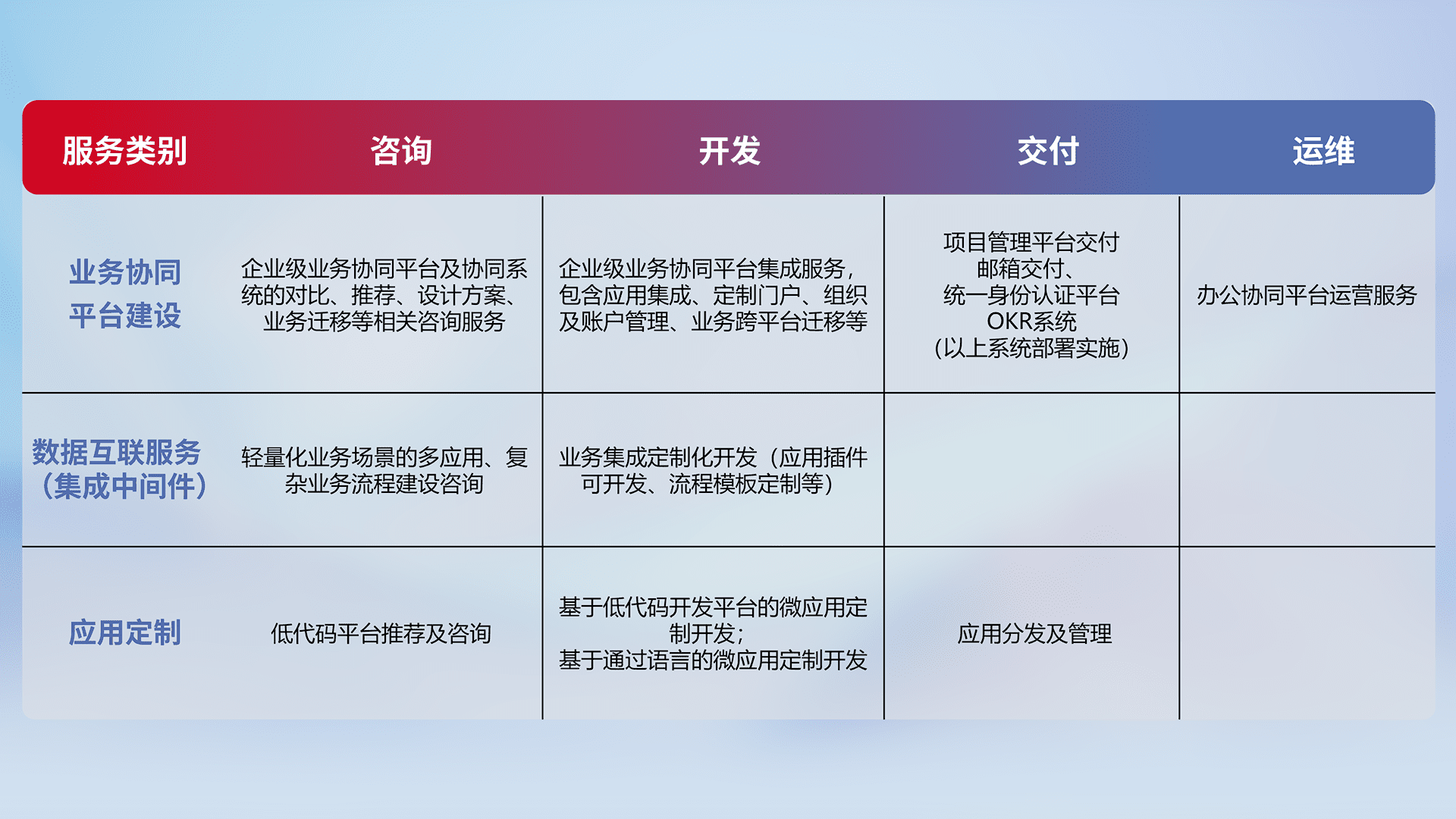 针对钉钉、、企微、、、IDaas等平台级产品提供产品的规划、、、方案、、交付、、、定制化开发等服务,,实现如统一协同办公、、智能客户服务、、、、混合会议管理、、、、智能数据查询、、、等业务场景,,实现数字化转型。。。